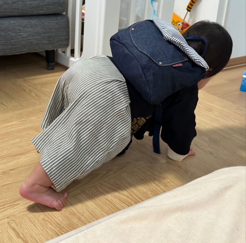 それぞれお米を5袋ずつ小袋につめて、お誕生日プレゼントであげたリュックに詰めて背負わせました。・・・が、やはり重かったみたいで、机につかまり立ちをして少しだけ伝い歩きをしていましたが、その後はハイハイで移動していました。