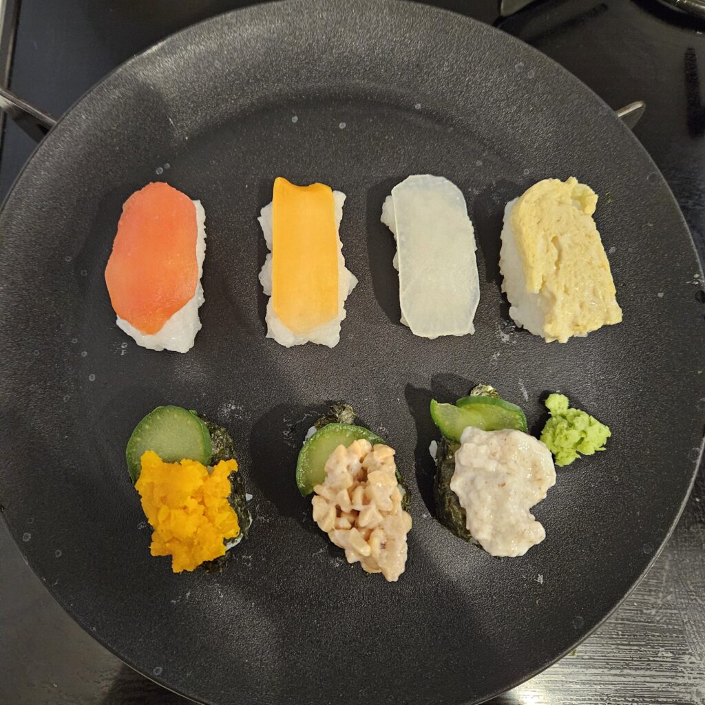 まだお寿司を食べることができない2人ですが、野菜をお刺身に見立てたお寿司を作りました。