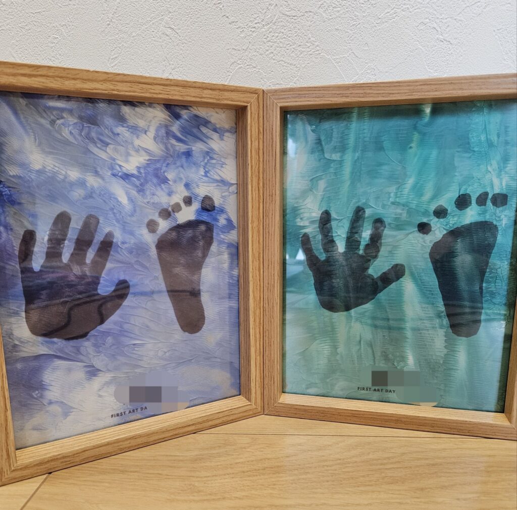 うまれてから初めて描くアートをファーストアートと言うそうなのですが、我が家は絵の具を使ってフォトフレームにペタペタグリグリしてもらいました。