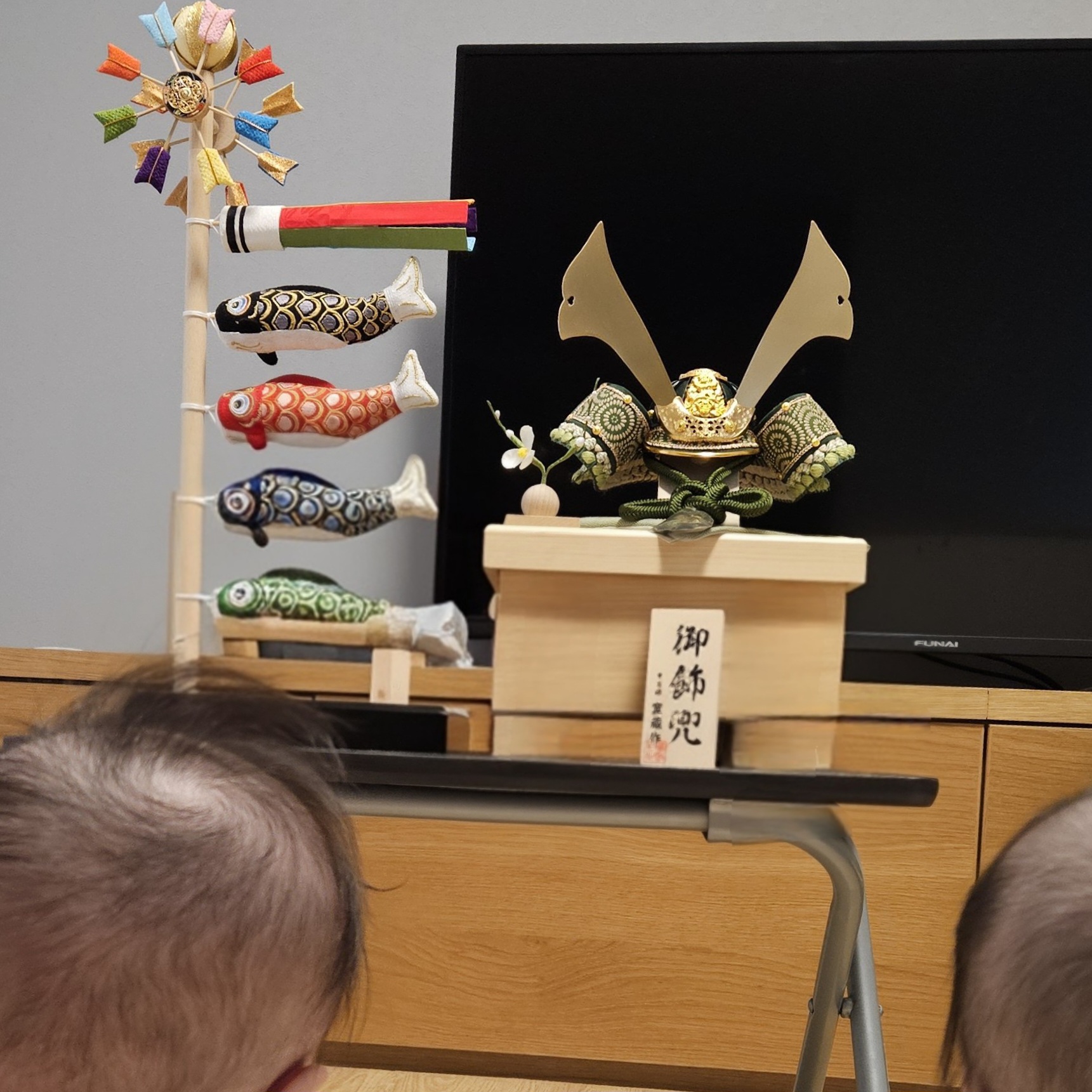 我が家は兜を1つ購入し、名前札のみ2つそれぞれ用意しました。また、あわせてこいのぼりも飾っています。